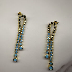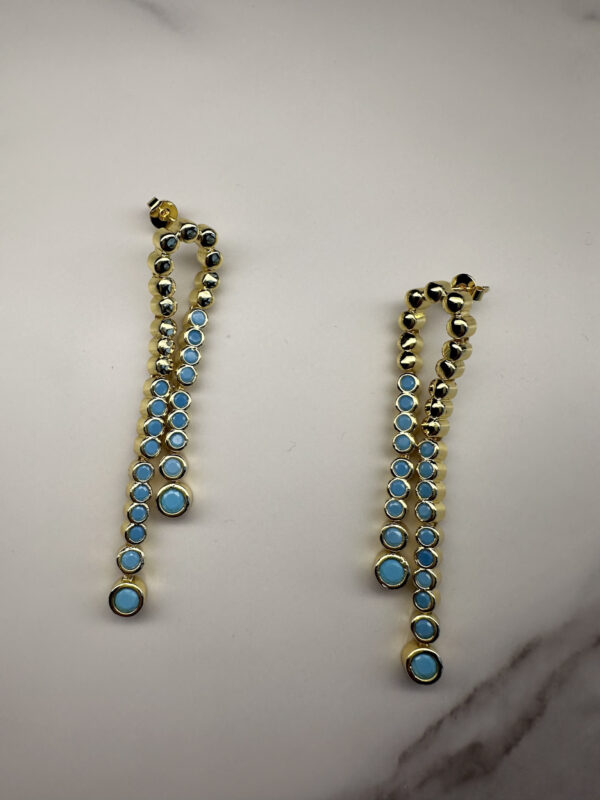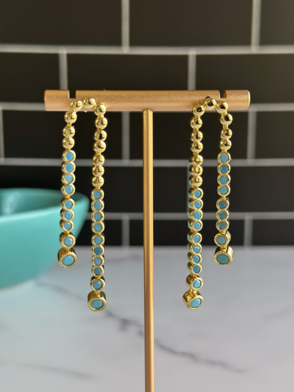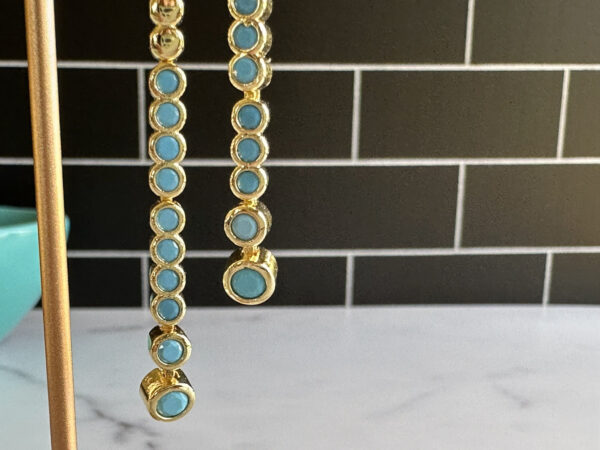 Sassy dangle earrings that resemble a classic tennis bracelet. With gold-tone and aqua blue enamel, these earrings are like hitting a perfect dropshot on game point.